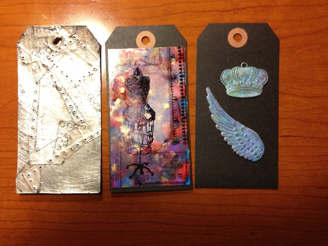 We enjoyed a full day of training on Ranger products and learning about products and techniques from Tim Holtz. The class focused on techniques, creating backgrounds and adding layers to the backgrounds. We played with Distress Ink, Distress Stains, custom masks, Distress Stickles, Paint Dabbers, Metal Foil tape, Perfect Pearl Mists, Alcohol Inks and . . . the BRAND NEW DISTRESS MARKERS! While creating the tags we learned tips about the products and why they work the way they do.
